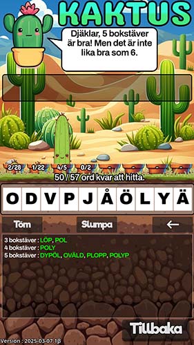 I Kaktus ges du 10 slumpade bokstäver och du ska försöka skapa så många ord du kan kan av dom. Längden på orden du ska skapa är mellan 3 och 10 tecken. Det finns dag, vecko och månadsutmaningar så att du förhoppningevist kan vara underhållen hela månaden såvida du inte är helt fantastiskt duktig.
